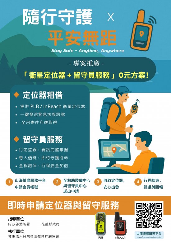 一、 依據社團法人台灣登山教育推展協會 114 年 8 月 28 日為國為民 705 號函辦理。 二、 相關資訊請逕洽山海博崴服務平台(https://www.solosocial.com.tw)。